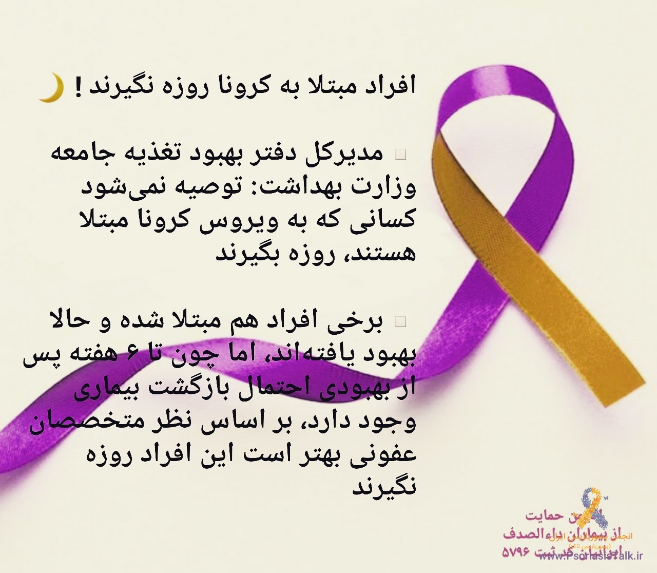 ▫️برخی افراد هم مبتلا شده و حالا بهبود یافتهاند، اما چون تا ۶ هفته پس از بهبودی احتمال بازگشت بیماری وجود دارد، بر اساس نظر متخصصان عفونی بهتر است این افراد روزه نگیرند