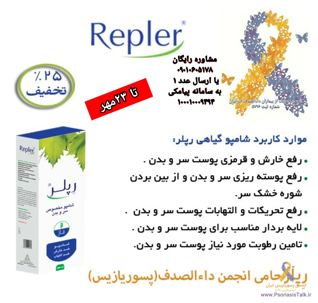 🔹طی صحبتهای انجام شده توسط هیات مدیره انجمن حمایت از بیماران داءالصدف ایرانیان (کدثبت ۵۷۹۶) با مدیریت محترم شرکت رپلر از ۸ تا ۲۳ مهرماه ۱۳۹۹ بمدت پانزده روز فروش چهار محصول تخصصی شرکت فوق برای اعضاء با ۲۵% تخفیف انجام خواهد شد